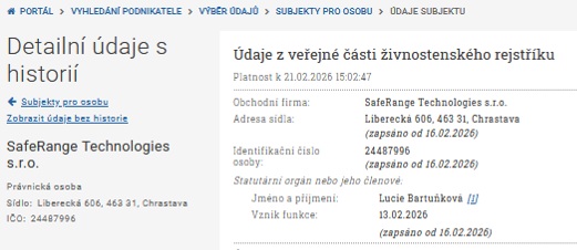 SafeRange Technologies s.r.o. operates as a registered Czech limited liability company. The documents below confirm: